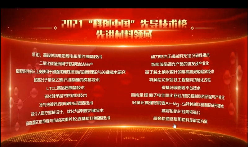 2022年2月21日,中国科协在“科创中国”年度会议上正式发布了2021“科创中国”系列榜单,其中先进材料领域低铂、高效燃料电池膜电极组件制备技术,二氧化碳循环用于炼钢清洁生产等18项技术入选“先导技术榜”,涉及了金属材料、无机非金属材料、高分子材料、复合材料等专业领域。